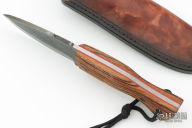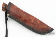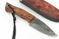 This Lunar by TS Custom Knives features a drop point  blade with forge finish and notched thumbrest, .169" blade stock and 1.555" blade depth, full tang construction. The handle has zebra wood scales with red liners and lanyard hole. Comes with a brown leather sheath and COA. New from maker at the 2024 Blade Show.