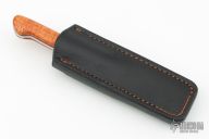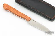 This Armagh by Jess Hoffman features a stonewash finished blade with .122" blade stock and .753" blade depth, full tang construction. The handle has dyed curly oak scales with black and orange liners. Comes with original box, papers and black leather sheath. New from maker at the 2024 Blade Show. #2457