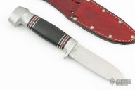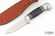 This knife by Remington features a satin finished drop point blade with a hidden tang construction.  .133" Blade Stock.  1.013" Blade Depth.  The handle features an aluminum guard and butt with a stacked black micarta grip.  Includes a brown leather sheath. Excellent Condition.