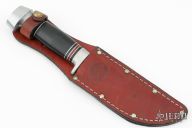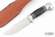 This knife by Remington features a satin finished clip point blade with a hidden tang construction.  .143" Blade Stock.  1.232" Blade Depth.  The handle features an aluminum guard and butt with a stacked black micarta grip.  Includes a brown leather sheath. Excellent Condition.