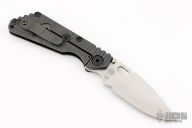 This SNG framelock folder by Mick Strider features a stonewashed blade and a Riffle pattern black G-10 and stonewashed titanium frame and tip up titanium clip. Includes a "Lock Bar Stabilizer" for maximum reverse lock retention. Nice detent, lockup and blade seating. Excellent condition.  Comes with a velcro case.