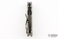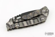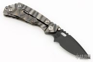 This PT by Mick Strider features a black blade with notched thumbrest and thumbhole. The handle has a Disruptive Strider Stripe finished titanium frame with matching tip up clip. New from maker at the 2024 Blade Show.