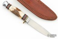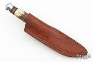 This knife by Weidmannsheil features a satin finished blade with .176" blade stock and .739" blade depth, hidden tang construction. The handle has a brass guard and an aluminum butt, stag grip with black/red spacers. Comes with a brown leather sheath. Has some light patina, otherwise excellent condition.