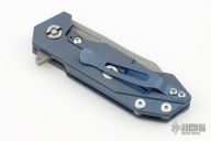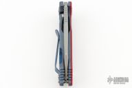 This Half Track from Hinderer Knives features a working finished Magnacut blade with fullers, notched thumbrest and flipper. The handle has a blue stonewashed titanium frame with a red G-10 scale. Titanium clip is positioned for tip up, right hand carry. Comes with original box and extra hardware. Has some scuffs and scratches, has been resharpened, otherwise good condition.