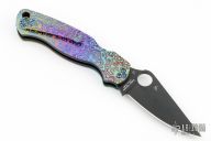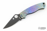 This Paramilitary 2 by Spyderco has a black clip point blade with thumb hole and notched thumb rest. The handle has custom laser engraved titanium scales and tip up clip. Excellent condition.