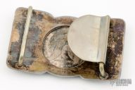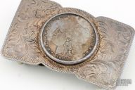 Engraved Sterling Silver Belt Buckle w/ 1885 Morgan Silver Dollar inlay. Can accept a 1.5" belt. Has patina, otherwise good condition. Stamped on the back "75-1" and "Sterling Custom Built Reno NV"