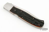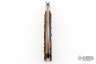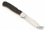 This Mid-Lock by Master Smith PJ Tomes features a hand rub satin finished blade with nail nick. The handle has stainless steel bolsters and stag jigged bone covers, stainless steel liners and backspacer. Excellent condition.