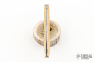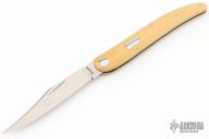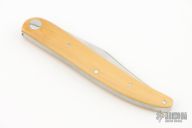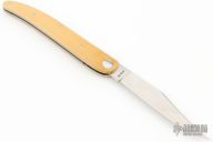 This Toothpick by Ken Coats features a hand rub satin finished blade with nail nick. The handle has yellow paper micarta covers and a stainless steel spring and escutcheon. Has some scratches, otherwise good condition.
