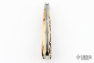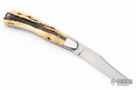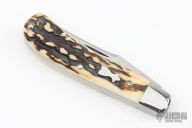 This Slipjoint by Master Smith Don Hanson III features a hand rub satin finished blade with nail nick and false top edge. The handle has 416 stainless steel bolsters, shield and liners with stag scales, and a steel spring. Has half stop, flush in all positions. Has a few light scratches, otherwise excellent condition.