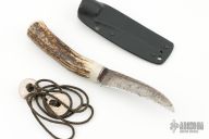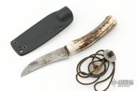 This Neck Pikal by Fred Perrin has a recurve blade .075" blade stock and .844" blade depth. Stag handle. Comes with a kydex sheath. New from maker.