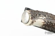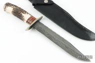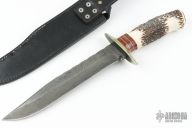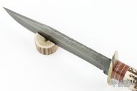 This Bowie from Barry Dawson features a Damascus blade with fileworked spine and false top edge, .210" blade stock and 1.535" blade depth, hidden tang construction. The handle has a nickel silver guard, stag grip with aluminum and stacked leather spacers, silver half dollar on the butt. Includes a black leather sheath and a zippered case. Excellent condition.