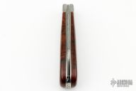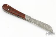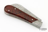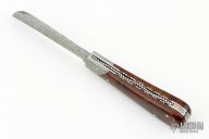 This knife features a hollow ground Damascus Blade. The handle has Damascus bolsters, ironwood scales, fileworked steel liners and backspacer. Half-stop flush in all positions. Excellent Condition.