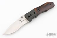 This Incinerator from Kirby Lambert features a satin finished recurve blade with dual thumbstuds, swedge and a notched thumbrest. The handle has carbon fiber bolsters, and wood scales, bead blasted titanium liners and a black tip down stainless steel clip. Smooth action.  Nice blade seating, detent, and lockup. Excellent condition.