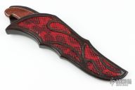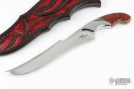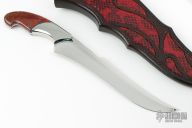 This Caladan by Steven Ramos features a mirror polished recurve blade with false top edge, .222" blade stock and 1.778" blade depth, full tapered tang construction with filework on the spine of the tang. The handle has dovetailed and mirror finished 304 stainless steel bolsters, polished Stoney Creek Poppy Jasper scales. Comes with a black leather sheath with Anaconda skin inlays. Comes with COA #70-1. New from maker.
