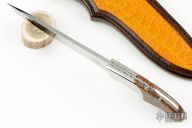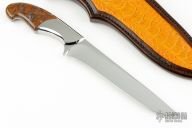 This Pisces by Steven Ramos features a mirror polished recurve blade with .194" blade stock and 1.255" blade depth, full tapered tang construction with filework on the spine of the tang. The handle has dovetailed and mirror finished 304 stainless steel bolsters, polished Maury Mountain Brecciated Jasper scales (from Oregon). Comes with a brown leather sheath with ostrich leg skin inlays. Comes with COA #69-7. New from maker.