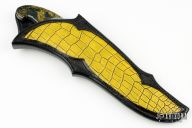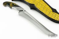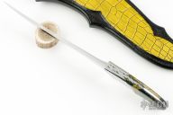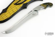 This Typhon by Steven Ramos features a mirror polished recurve blade with false top edge and fullers, .242" blade stock and 1.885" blade depth, full tapered tang construction with filework on the spine of the tang. The handle has dovetailed and mirror finished 304 stainless steel bolsters, polished San Simeon Jasper scales. Comes with a black leather sheath with alligator skin inlays. Comes with COA #71-1. New from maker.