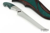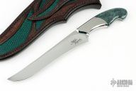 This Telson by Steven Ramos features a mirror polished recurve blade with .201" blade stock and 1.376" blade depth, full tapered tang construction with filework on the spine of the tang. The handle has dovetailed and mirror finished 304 stainless steel bolsters, polished Clear Creek Jadeite scales (from California). Comes with a brown leather sheath with lizard skin inlays. Comes with COA #68-1. New from maker.