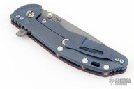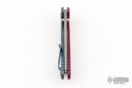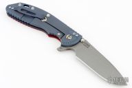This XM-24 from Hinderer Knives features a stonewashed blade with swedge, dual thumb studs, notched thumb rest and flipper. The handle has a red G-10 scale with a battle blue finished titanium frame, pocket clip, hardware and lock bar stabilizer, and lanyard hole in pommel. Includes the original box and extra hardware. Excellent condition.