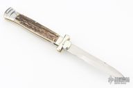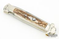 This lockback Auto by AGA Campolin has a stainless steel spear point blade with false top edge. Handle is stag with nickel silver bolsters, brass liners, stainless steel backspacer. Comes with original box. Excellent condition.