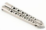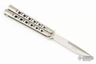 This Model 42 Balisong by Benchmade features a tumbled finished blade with swedge. The handle has an integral skeletonized stainless steel handles with spring T latch on pommel. Comes with nylon sheath and original box. Excellent Condition.
