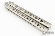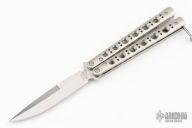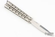 This Model 62 Balisong by Benchmade features a stonewashed spear point D2 blade with a false top edge. The handle has stainless steel handles and latch. Includes the original box, papers and nylon sheath. Excellent condition.