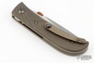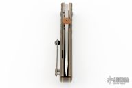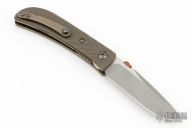 This Jack Pine Savage Jr. by Patrick Doyle features a two-tone stonewash finished blade with a knurled copper thumbdisc. The handle has a milled anodized titanium frame with textured edges, titanium liners and crystalized tip up clip, and anodized titanium screws. Nice detent, lockup and blade seating. Comes with original box and COA. Has a few light scratches otherwise the knife is in excellent condition.