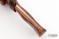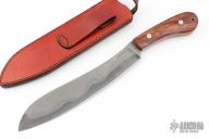 This Parang from Master Smith Jim Crowell features a hand rub satin finished blade with hamon, .194" blade stock and 1.629" blade depth, full tapered tang construction. The handle has Thuya burl wood scales. Includes a brown leather sheath. Excellent condition.