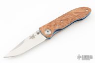 The 690 Elishewitz is a discontinued linerlock folder by Benchmade. It features a clip point stonewashed polish finished blade with maple burl scales, and anodized titanium liners, tip down stainless steel clip. Comes with original clam shell/clasp box. Excellent condition. Blade is marked "Prototype August 2002".