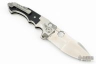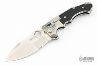 The Alpha-S knife from Andre de Villiers is a masterwork combining functionality and personality. This one has a satin finished partially serrated blade with thumbhole, notched thumbrest and flipper. It swings smoothly on a ball-bearing system and has both a thumb hole and flipper opener; it can also be opened or closed with a flick of the wrist when the black G-10 inlaid button lock is held down. A safety switch on the side allows the blade to be locked in the closed position or provides an additional level of safety in the open position. It has a milled titanium handle with black G-10 inlays that offers an extremely comfortable grip. A jimped, black titanium backstrap with a lanyard hole and a tip-up, black, titanium pocket clip with hidden screws. Comes with original hard case. "21-2021" on the ricasso. Excellent condition.