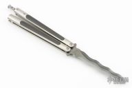 This RARE balisong features a black double-edged kris blade with scalpel edges, this knife has no safe handle for knife minipulation. The integral handles are satin finished titanium with carbon fiber inlasy and a spring latch. #31 of 50 on blade. Comes with original box. Excellent condition. VERY RARE.