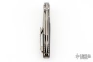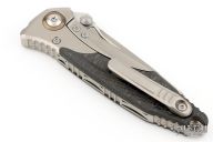 This Socom Bravo by Microtech is made in China by Rike Knife, it features a bead blasted blade with a fully serrated edge, notched thumbrest, and dual thumbstuds. The handle has bead blasted titanium bolsters/liners, anodized pivot collars, carbon fiber scales. Tip up carry bead blasted titanium clip. Bead blasted titanium backspacer. Dated 07/2022 and s/n 1767. Comes with original box and papers. Excellent condition.