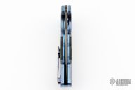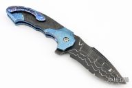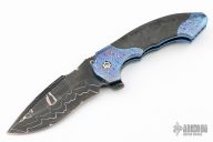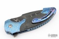 This gorgeous Archangel from Mr. Fischer features a Sole Authorship low layer Damascus (1095 and Nickel) recurve blade with false top edge, notched thumbramp and flipper. The handle has MokuTi  bolsters, front and rear, carbon fiber scales, anodized titanium liners, notched MokuTi backspacer, and a tip up MokuTi clip with hidden screws. Blade is centered when closed and locks up with no play. Nice crisp detent. Very smooth action thanks to Mr. Fischer's bearing system. Excellent condition. The only visible screws on this knife is the pivot.