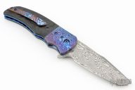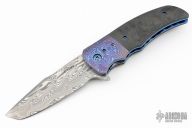 This Rogue flipper by Sean O'Hare features a Damascus tanto blade with a flipper. The handle has MokuTi bolsters, marble carbon fiber scales, anodized titanium liners with jeweled interiors, fileworked and anodized titanium backspacer, and a tip up MokuTi clip. Nice detent, lockup and blade seating. Rides on bearings. Excellent condition.