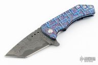 This Titan 2 by Sergey Rogovets features a tanto style San Mai Damascus blade with a flipper tab and notched thumbrest. The handle has a milled Mokuti frame, a zirconium pocket clip, tip up carry, and notched copper backspacer. Satin finished hardware. Locks up with no play, has a lockface insert. S/N 1569 signed in the frame. Excellent Condition.