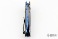 This QSP by Peter Martin features a San Mai Damascus blade with pyramid cut super conductor thumb lug and a flipper, notched thumbrest. The handle has blackened Super Conductor bolsters, zirconium scales, anodized titanium liners with jeweled interiors, matching San Mai Damascus backspacer, and a tip up super conductor clip. Nice detent, lockup and blade seating. Excellent condition.