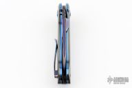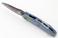 This QSB by Peter Martin features a sole authorship San Mai Damascus blades with a single mokuti thumbstud and a fileworked thumbrest.  The handle has zirconium scales with mokuti inlays, mokuti pivot collars, San Mai Damascus backspacer and tip up mokuti pocket clip with hidden screws.  Nice Detent, lockup and blade seating. Excellent Condition.
