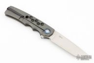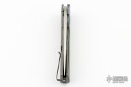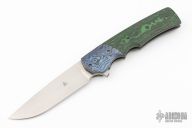 This Hunter by Jason Clark features a hand rub satin finished blade with checkered flipper. The handle has a dovetailed Black Timascus bolster and pivot collar, green/black carbon fiber scales, bead blasted titanium liners, black titanium tip up clip and black stainless steel backspacer. Rides on IKBS, nice detent, lockup and blade seating. Excellent condition.