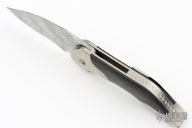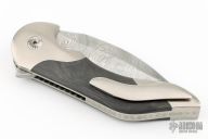 This Føniks Linerlock Flipper by Glenn Are Hovin features a Damasteel blade with false top edge and flipper. The handle has orange peel finished titanium bolsters, front and rear, custom milled pivot, carbon fiber scales, titanium liners with jeweled interiors, jeweled titanium backspacer, tip up orange peel finished pocket clip with hidden screws. This knife's only hardware visible is the pivot, every other screw on the knife is hidden, pretty impressive and clean. Nice detent, lockup and blade seating. Excellent condition. All the lines on this knife are super clean.
