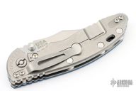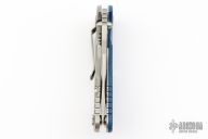 This XM-18 Bowie by Rick Hinderer Knives features a 3.5" stonewash finished blade, notched thumbrest and dual thumbstuds. The handle has a black/blue G-10 scale, and stonewashed titanium handle/clip. Clip can be mounted for tip up or down carry. Tri-way pivot system.  Nice lockup, and detent. Includes the original box, extra hardware. Excellent Condition.