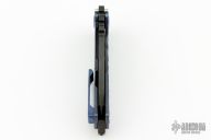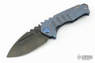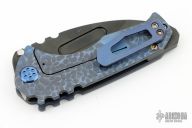 This Praetorian Genesis T from Medford Knife and Tool features a PVD coated drop point, style blade with fuller, notched thumb rest and dual thumb studs. The handle has a textured and anodized titanium frame over a D2 backspacer/glass breaker. Stonewash titanium tip up clip. Great blade seating, detent and lock up. Excellent condition.