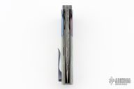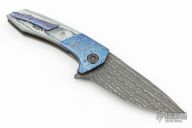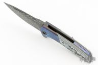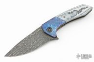 This Morbius by Edison Barajas (Sharknivco) features a Chad Nichols Damascus blade with notched flipper and milled thumbrest. The handle has timascus bolsters, Carbo Quartz scales, bead blasted titanium liners, timascus backspacer and tip up clip with hidden screws. Nice detent, lockup and blade seating. Excellent condition.