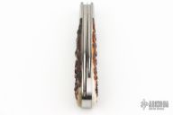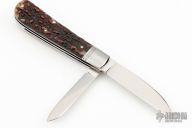 This two-blade swayback from Ryuichi Kawamura features two hand rub satin finished blades with Ryu's mirror polished ricassos and swedges, both have nail nicks. Both have half-stops. Spring is flush in all positions. The handle has threaded stainless steel bolsters, stainless steel liners and springs and stag covers. This is a gorgeous example of Ryuichi's talent/craftsmanship. Includes a velcro case.  Excellent Condition.