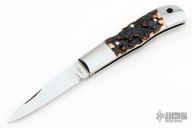 This Jess Horn Tribute by Ryuichi Kawamura features a hand rub satin finished blade with a single nail nick.  The handle has integral stainless steel bolsters/liners and stag scales. Nice lockup and blade seating. Has a great snap when its opened. Comes with a velcro case. This thing is stunning.  Has some light hairline scratches on the blade otherwise the knife is in excellent condition.
