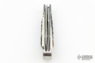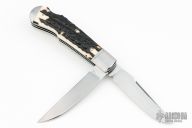 This gorgeous two-blade stag Trapper from Ryuichi Kawamura features two hand rub satin finished blades with Ryu's mirror polished ricassos and swedges. The master blade features a lockback locking mechanism while the secondary blade utilizes a traditional slipjoint design with half stop. Spring is flush in all positions. The covers on this piece are premium stag and both are nicely matched. This is a gorgeous expample of Ryuichi's talent/craftsmanship. This piece is in excellent condition, shows no signs of carry or use, only VERY light handling marks. Knife comes in a velcro padded case.