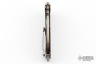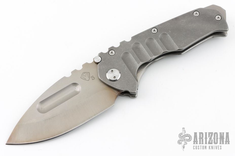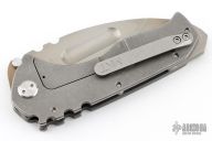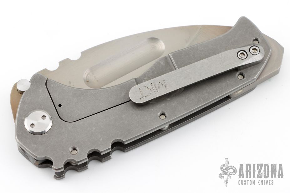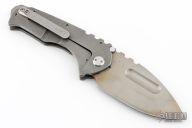 This Praetorian T by Medford Knife and Tool features a vulcan finished blade with fullers and notched thumbrest. The handle has a tumbled titanium frame with a titanium tip up pocket clip and a D2 backspacer/glass breaker with lanyard bail.  Includes original box, hard case and COA dated 1-13-16. Excellent condition.