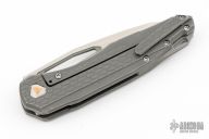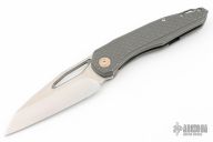 This Sigil by Deryk Munroe features a two-tone finished blade with thumb hole and notched thumbrest. The handle has a tumbled titanium frame with stepped milling pattern, titanium hardware, a titanium backspacer, tip up titanium clip, and stainless steel lockface insert/internal overtravel stop. Has a copper pivot inlay. Nice detent, lockup and blade seating. Rides on bearings. Comes with original packaging, COA and band-aid. Excellent condition.