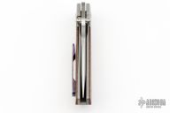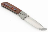 This Mula by Enrique Pena features a hand rub satin finished drop point blade with swedge, notched thumbrest and dual thumbstuds. The handle has a blasted titanium frame with micarta scales, and a tip up mokuti clip. Nice detent, lockup and blade seating. Comes with zippered case. Has a couple light scuffs, otherwise excellent condition.
