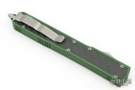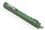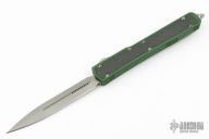 This Makora II OTF automatic by Microtech features a bead blast finish double edge blade with a standard edge, and carbon fiber inserts on both sides of the green aluminum handle. Bead blast stainless steel clip. Glass breaker. Serial number 05807 and dated 03/2015. Comes with original box and papers. Excellent condition.