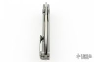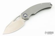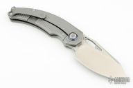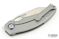 This knife by Kunwu Knives features a satin finished blade with notched thumbrest and front flipper. The handle has a textured titanium frame with matching backspacer and tip up clip, mokuti pivot collar. Includes the original box and papers.  Excellent condition.