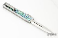 This Custom NYX by Heretic Knives features a double edged mirror polished blade with fullers. The handle has a two-tone stainless steel frame with abalone inlays, titanium clip with ceramic ball insert, glass breaker at the butt. Comes with original box, zippered case and COA. New from maker! #016 and dated 06/2024